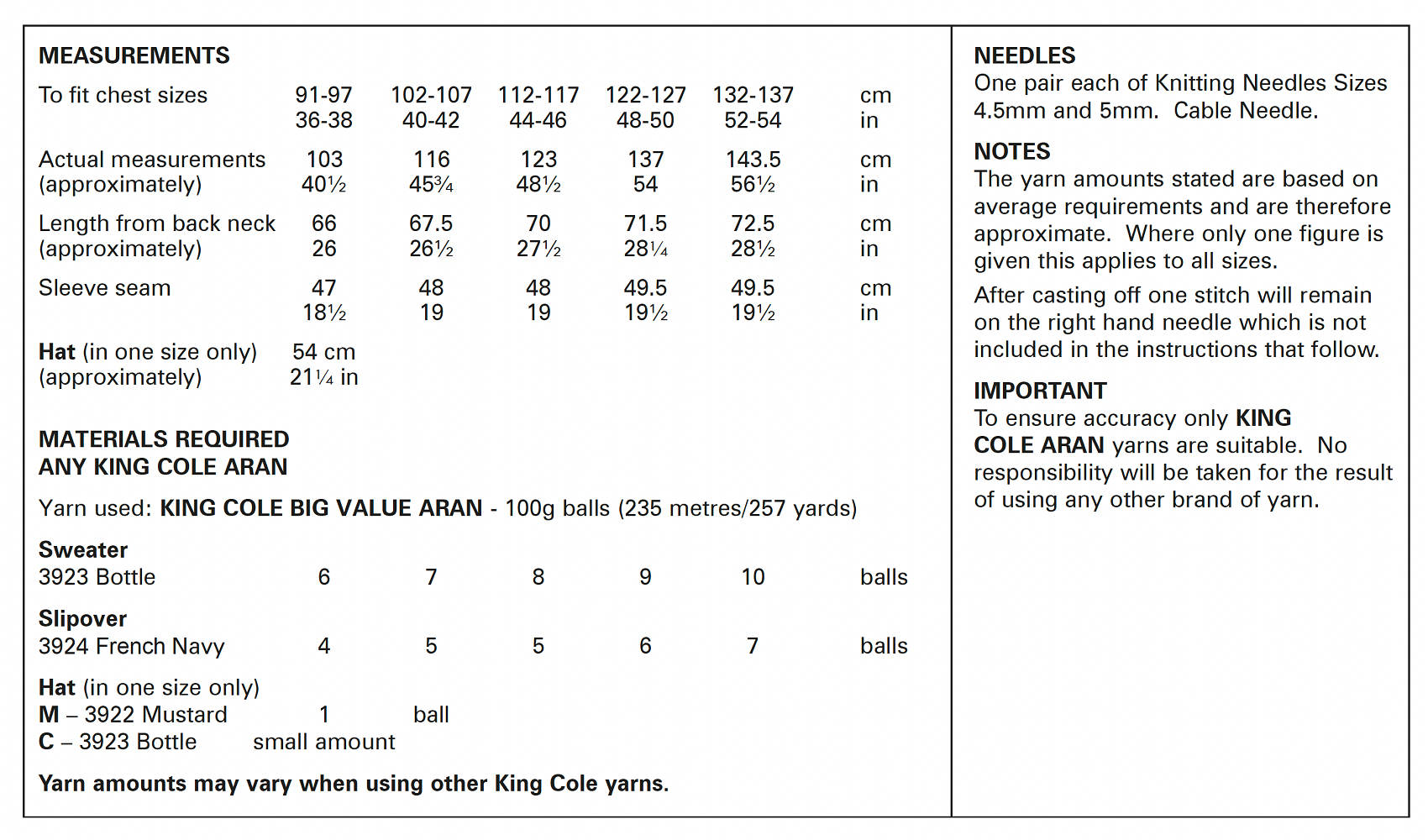 Details: This is a King Cole Aran knitting pattern that instructs you on how to knit a man’s Sweater, Slipover and Hat, using Big Value Aran yarn.