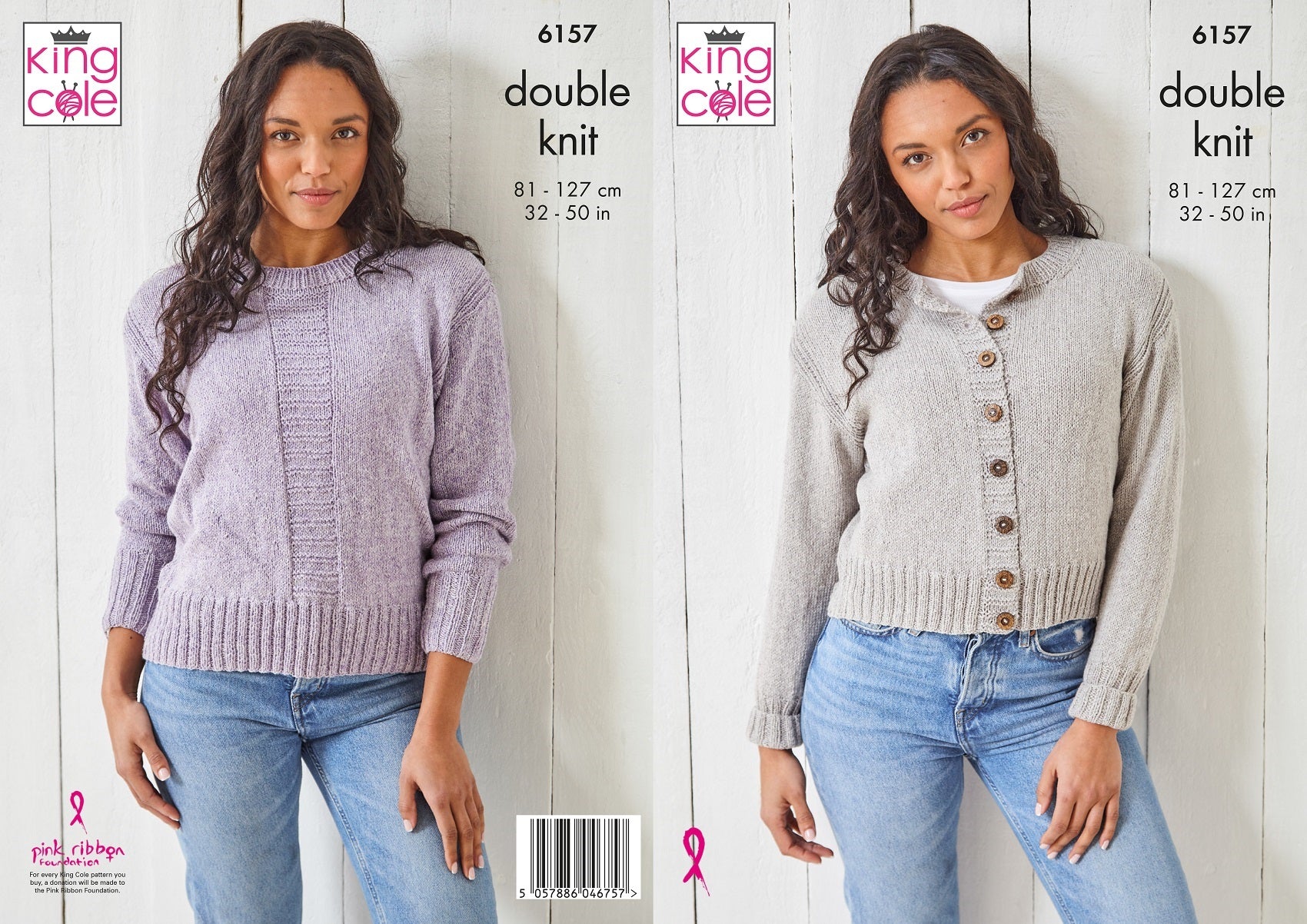 This double knit knitting pattern leaflet 6157 by King Cole will instruct you on how to create a ladies cardigan and sweater with front detail.