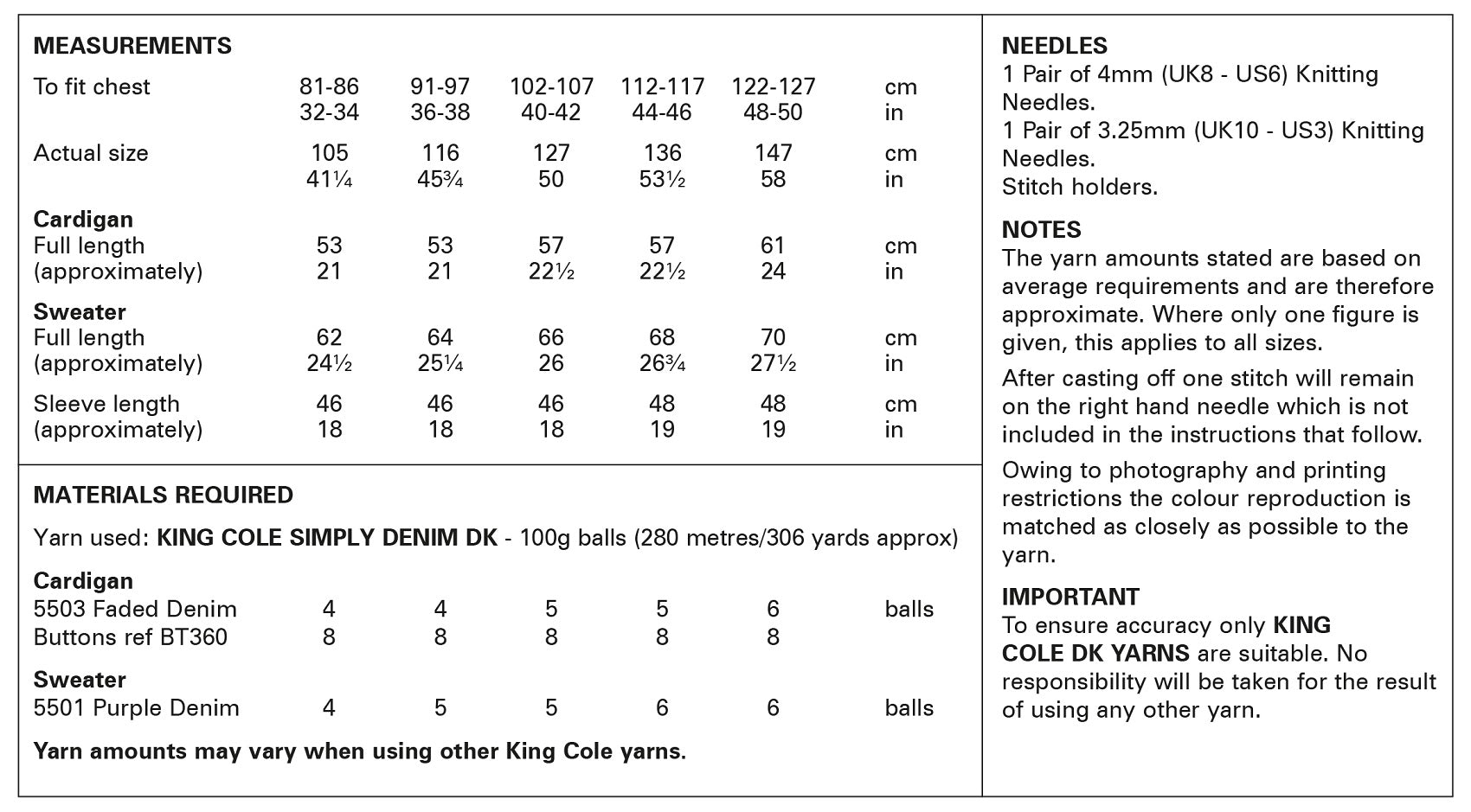 This King Cole knitting pattern is suitable for use with most King Cole double knit yarns; however, tensions may vary, and we recommend you knit a tension square before knitting the whole garment.