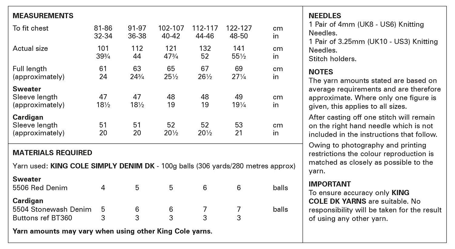 This King Cole knitting pattern is suitable for use with most King Cole double knit yarns; however, tensions may vary, and we recommend you knit a tension square before knitting the whole garment.