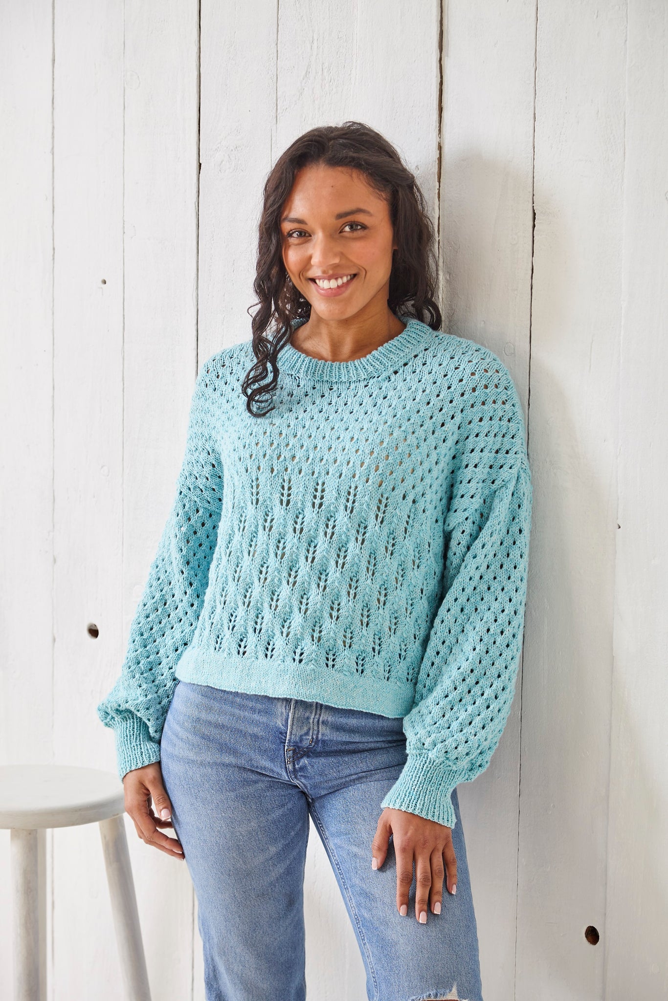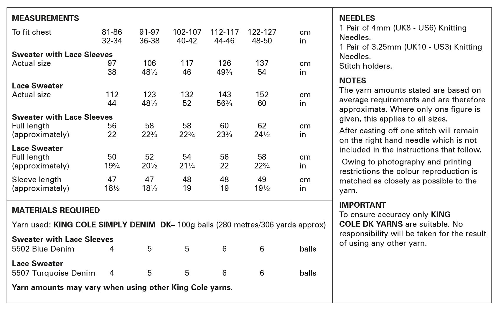 This double knit knitting pattern leaflet 6159 by King Cole will instruct you on how to create a ladies lace sleeved sweater and a lace sweater.