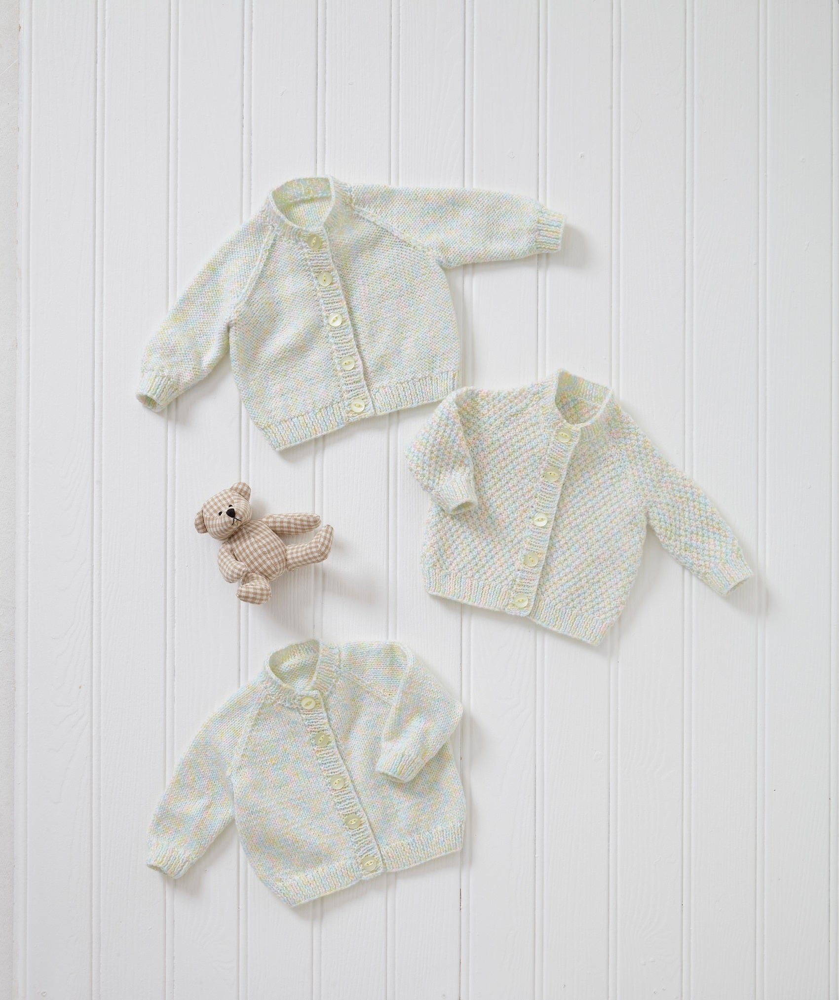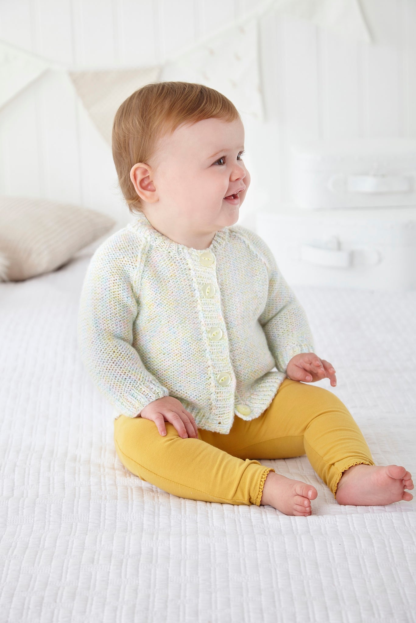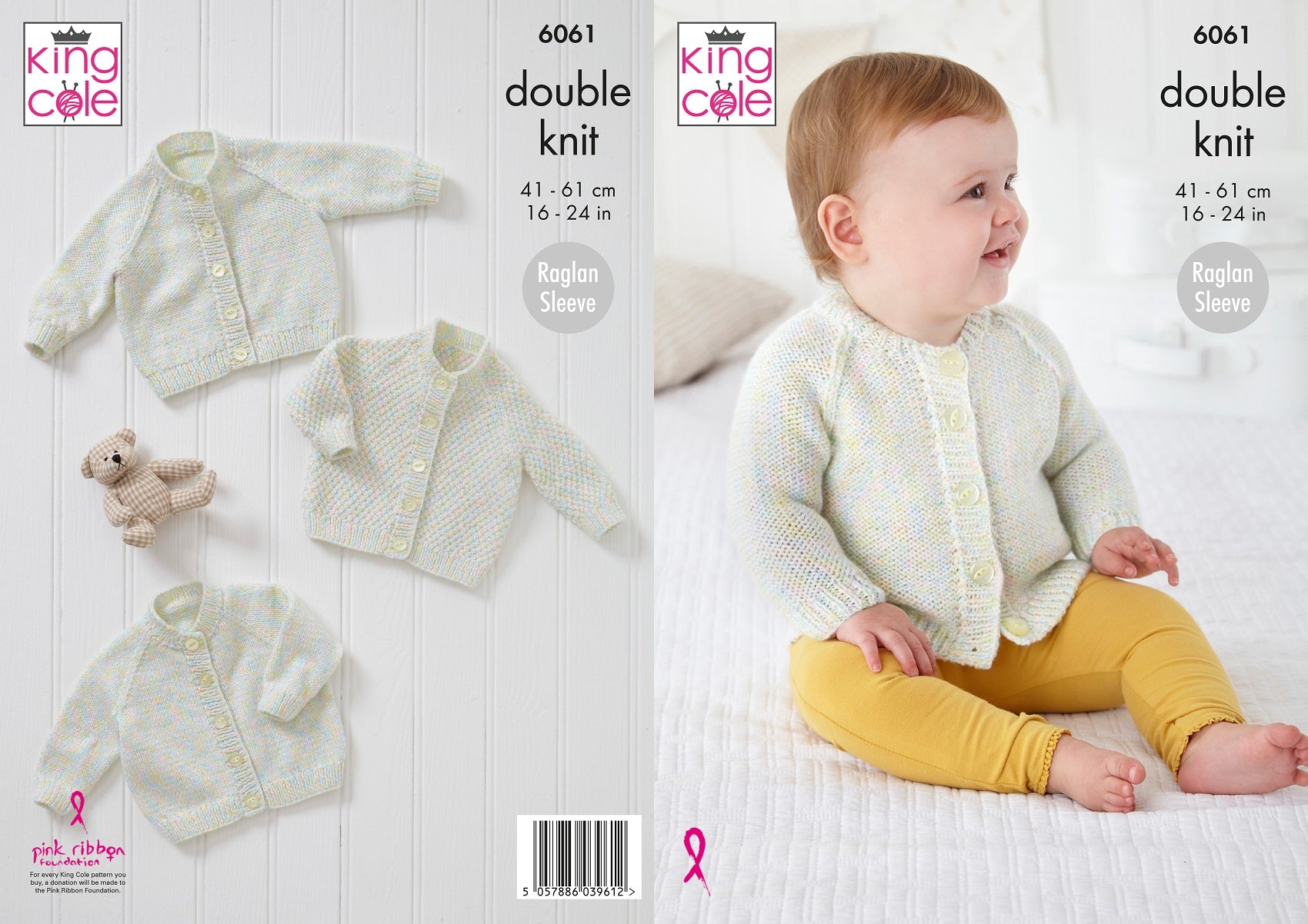 This baby double knitting pattern leaflet 6061 by King Cole will instruct you on how to create a raglan sleeve cardigan with different designs and techniques.