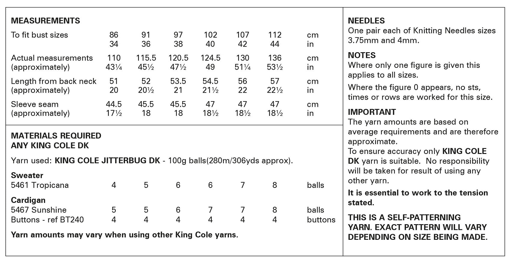 This King Cole knitting pattern is suitable for use with most King Cole double knit yarns; however, tensions may vary, and we recommend you knit a tension square before knitting the whole garment.