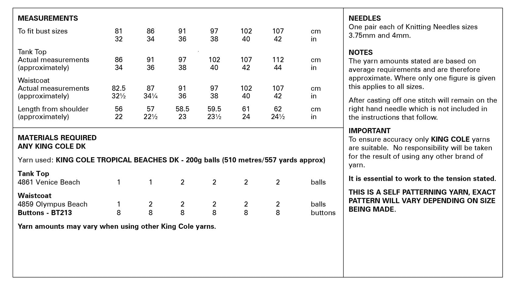 This King Cole knitting pattern is suitable for use with most King Cole double knit yarns; however, tensions may vary, and we recommend you knit a tension square before knitting the whole garment.