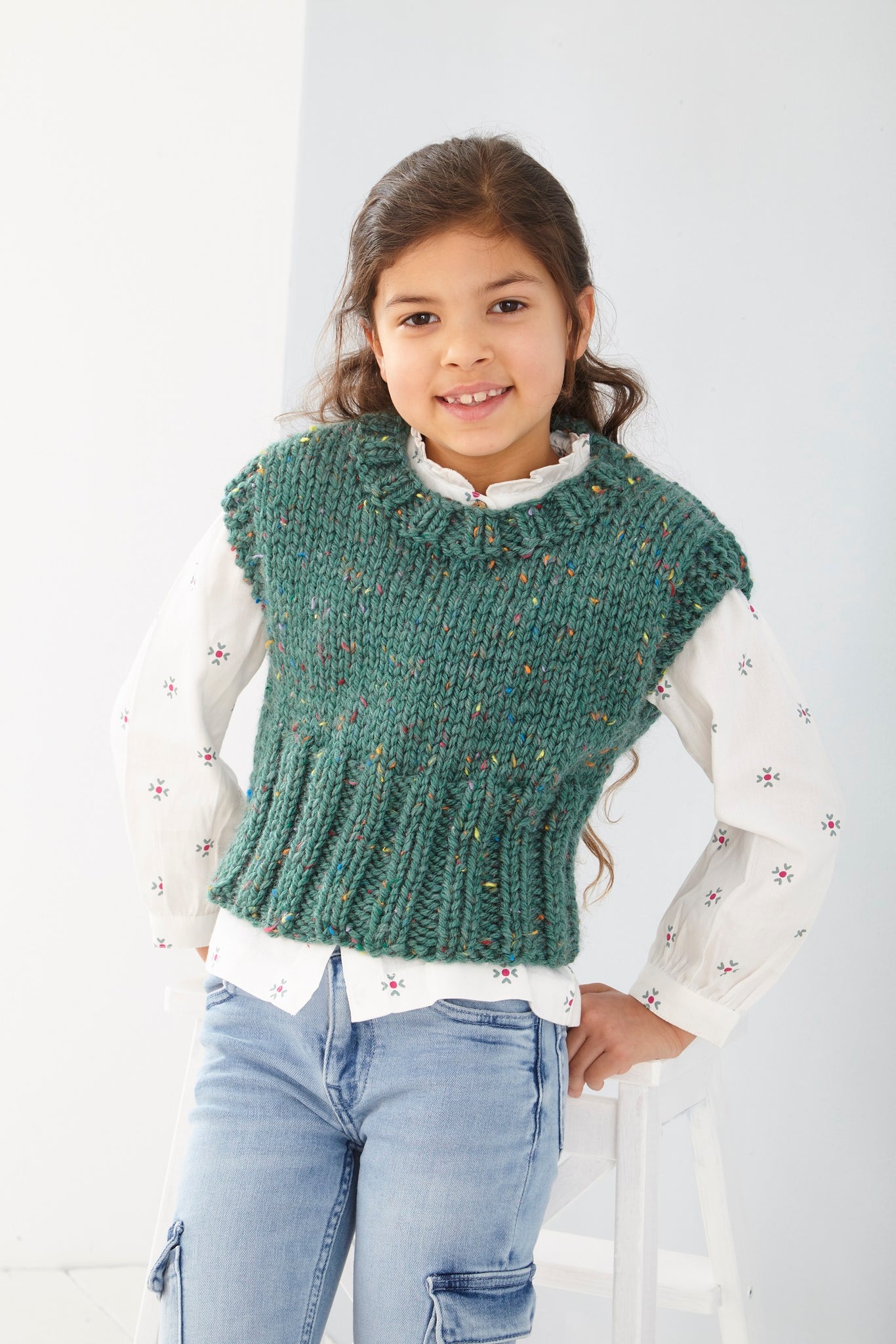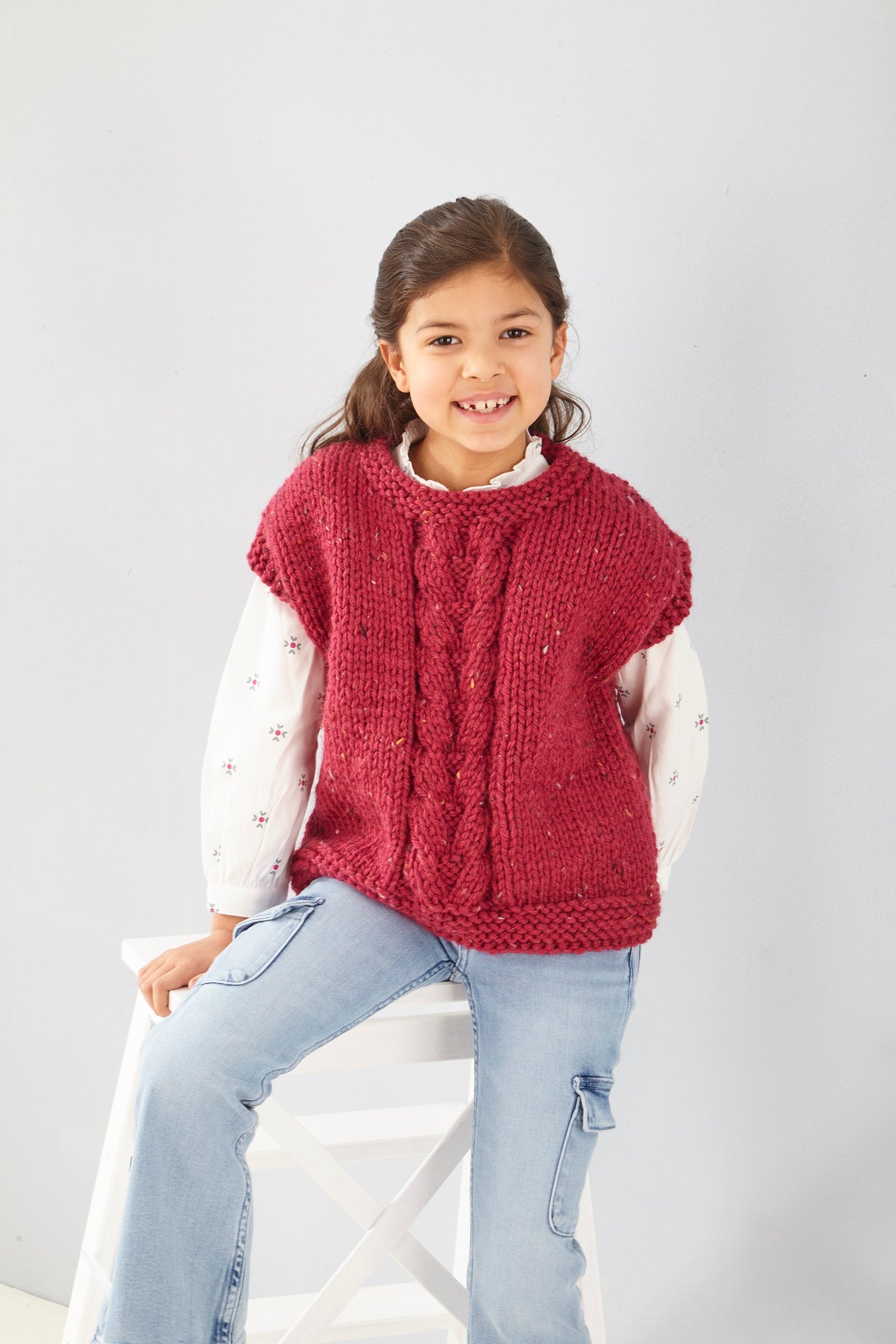 Details: This is a King Cole knitting pattern that instructs you on how to create a girls overtop & vest, using Big Value Super Chunky Tweed yarn.