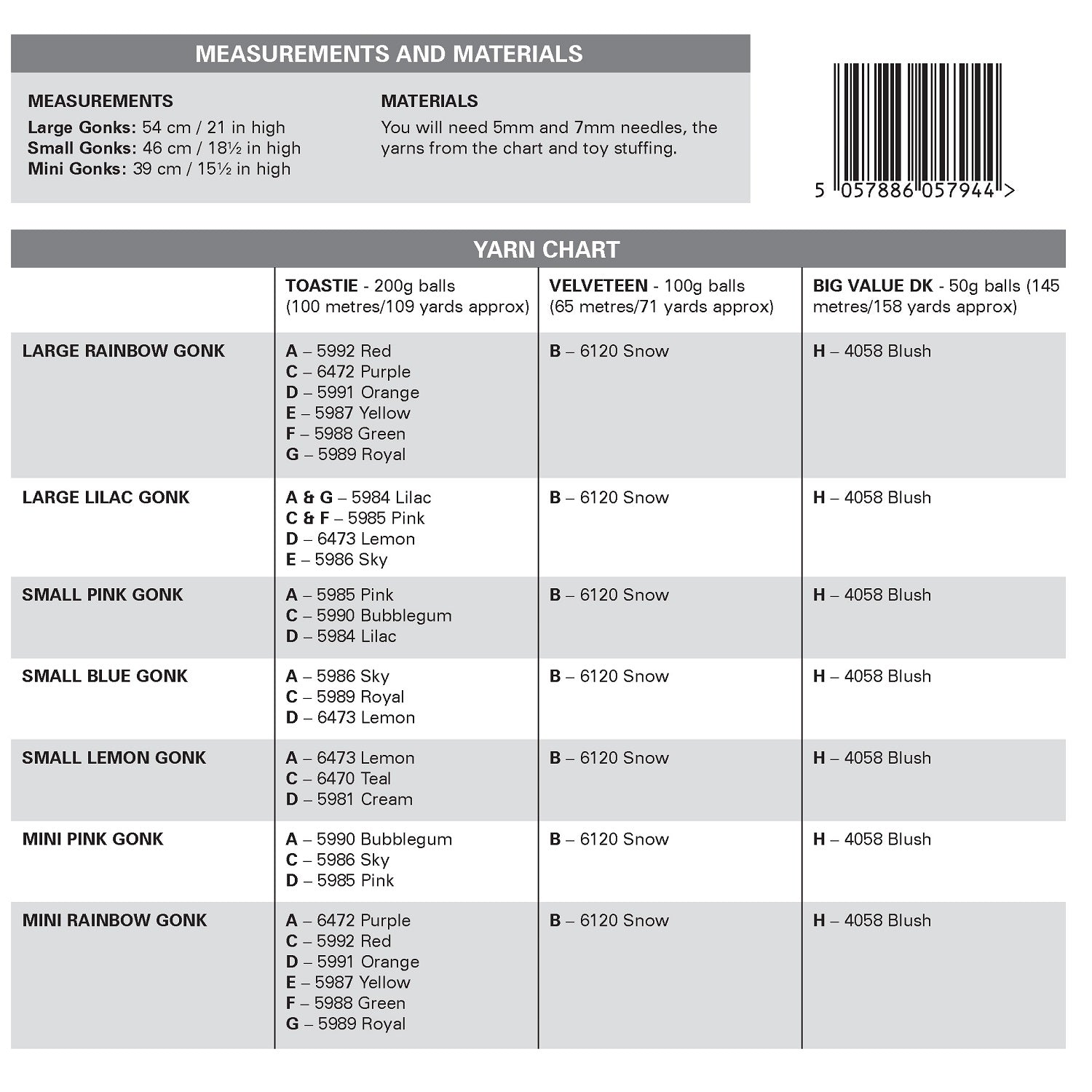 Details: This is a King Cole knitting pattern that instructs you on how to create colourful Gonks, using Toastie yarn.