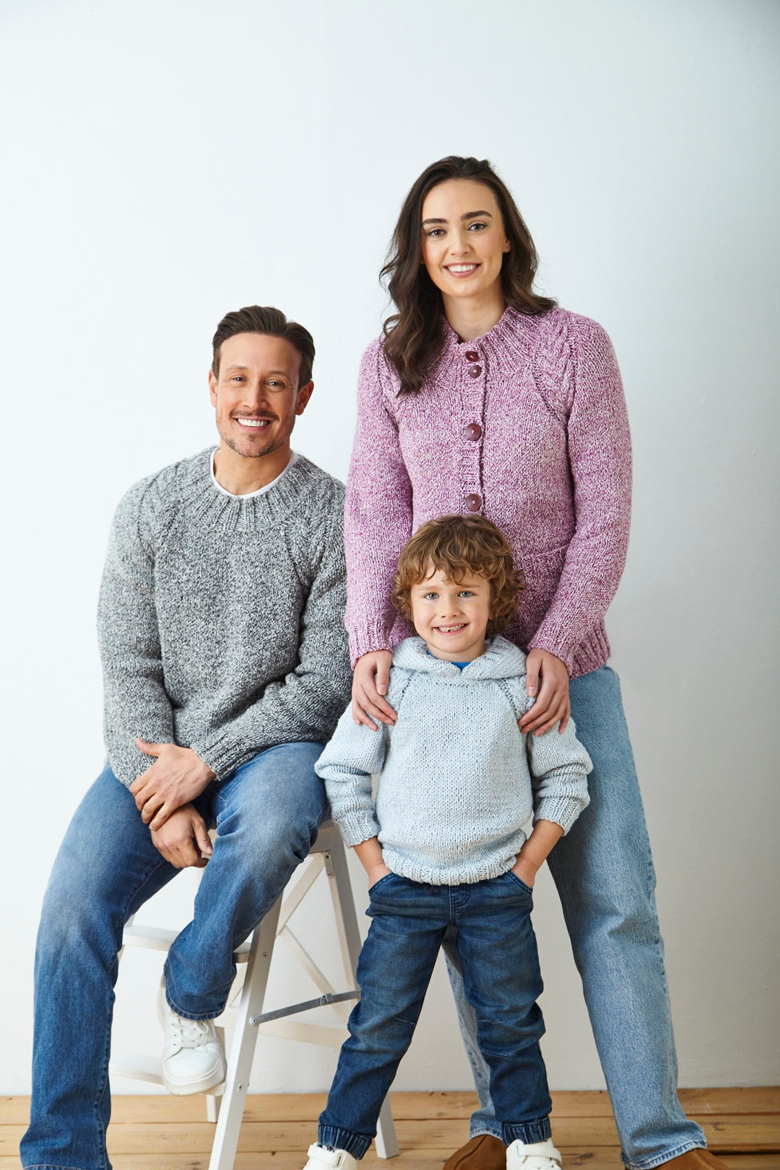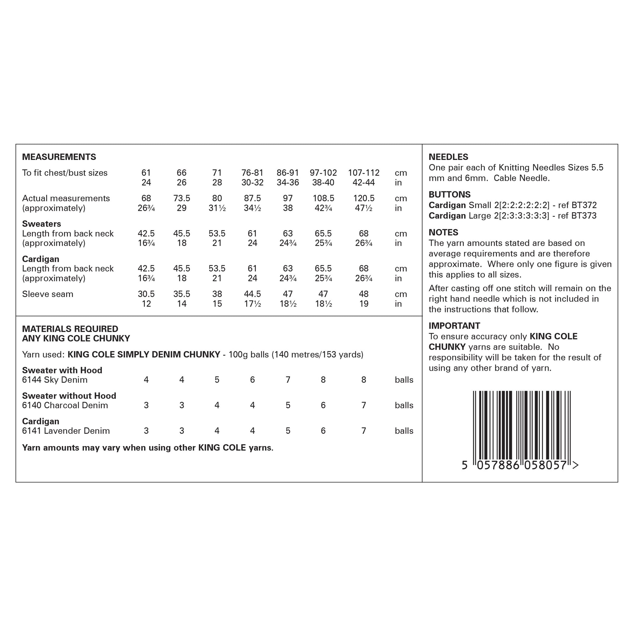 • Details: This is a King Cole chunky knit pattern that instructs you how to knit kids and adults sweaters and cardigans using King Cole Simply Denim Chunky.
