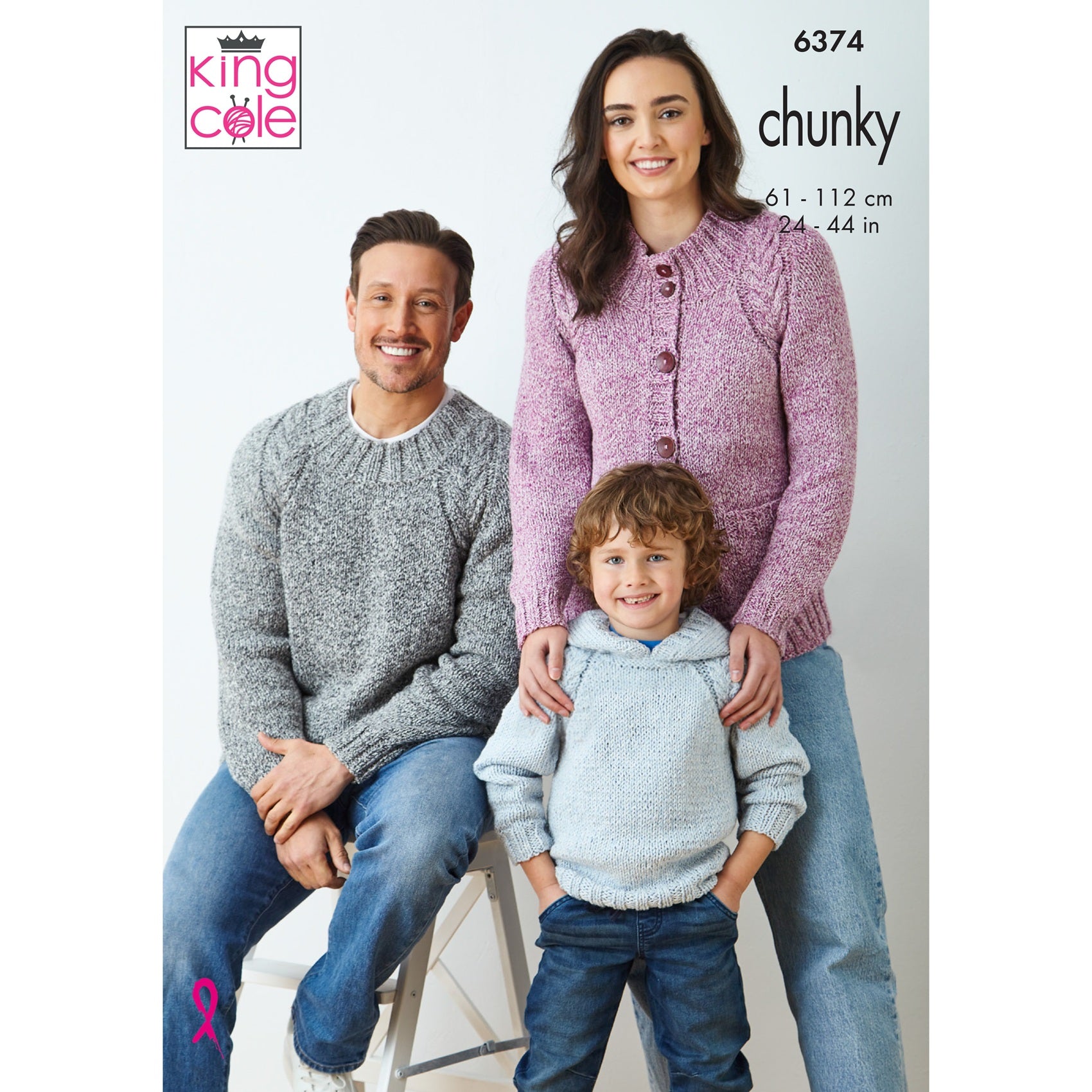 This chunky knitting pattern leaflet 6374 by King Cole will instruct you on how to create various jumpers or cardigans for both men, women and children.