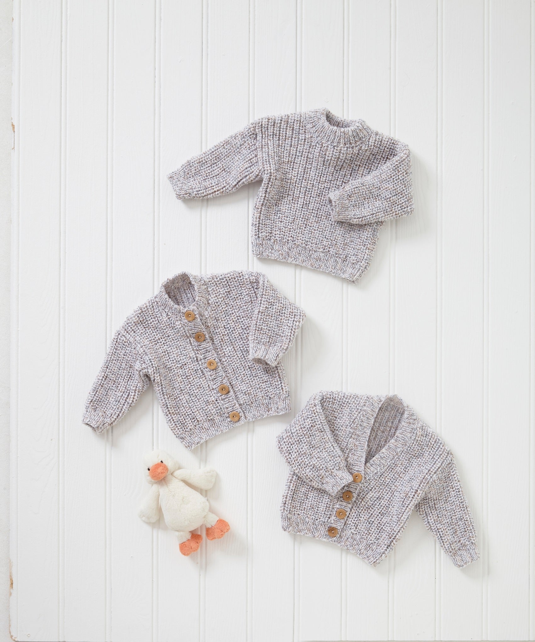 This baby double knitting pattern leaflet 6058 by King Cole will instruct you on how to create a sweater, round neck & v neck cardigan.