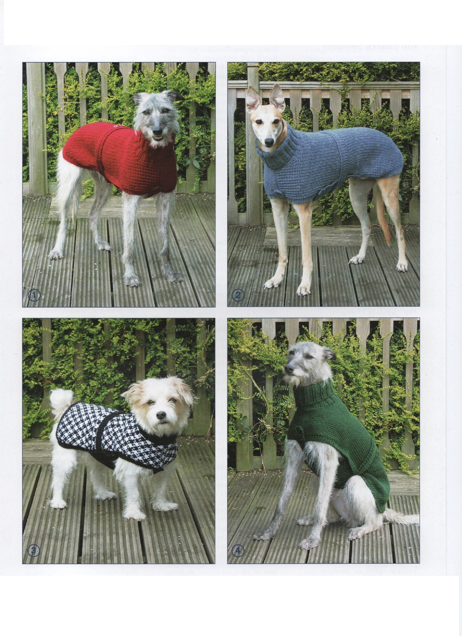 This double-knit and chunky knitting pattern leaflet will instruct you on how to create three different designs of dog sweaters and one coat.