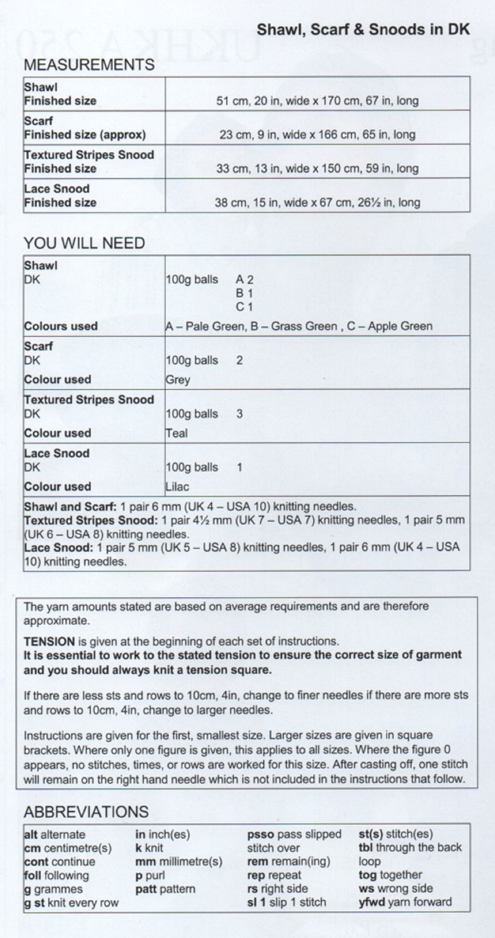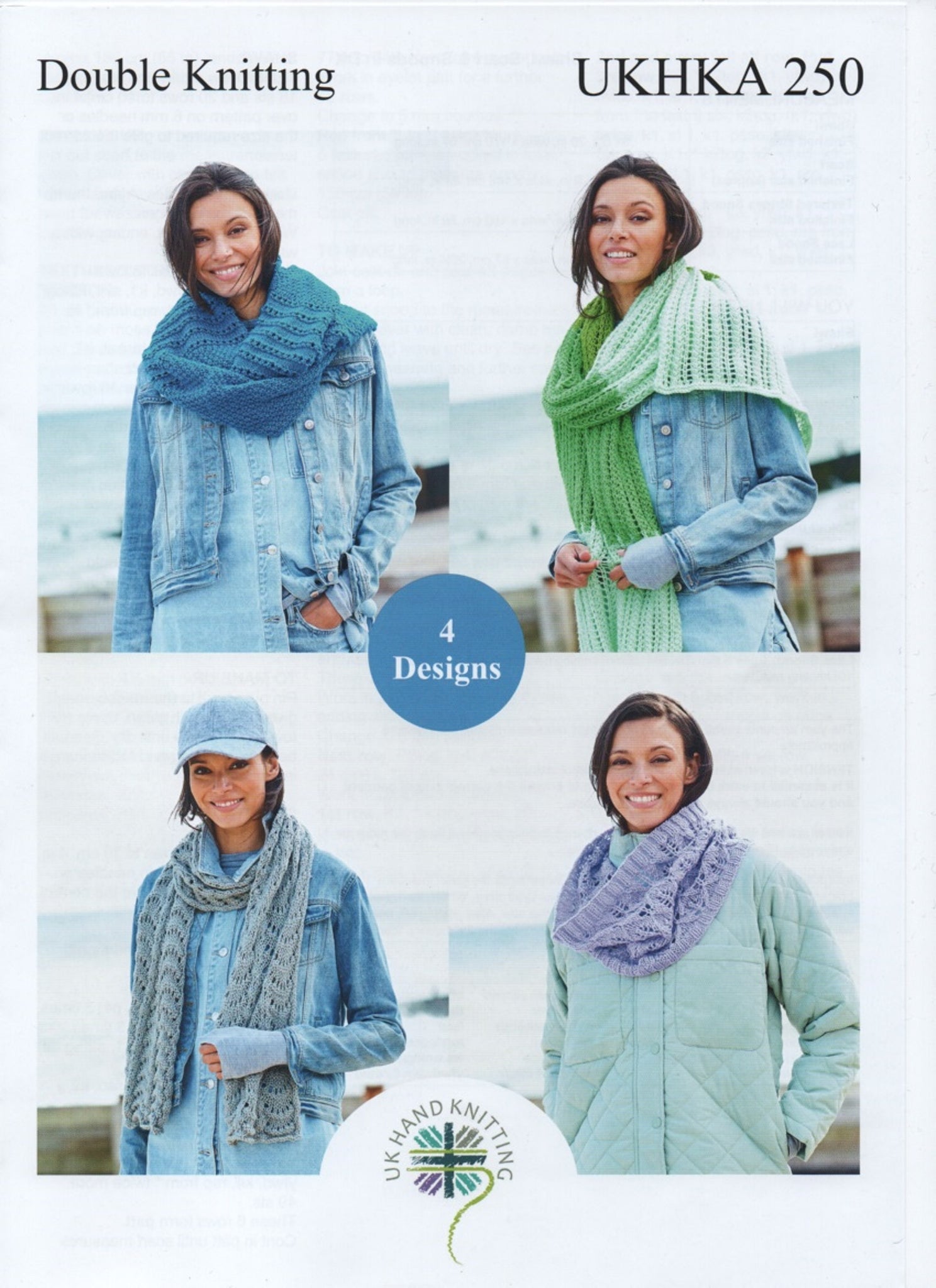 This UKHKA double knit knitting pattern leaflet 250 will instruct you on how to create a lady's shawl,scarf & snoods.
