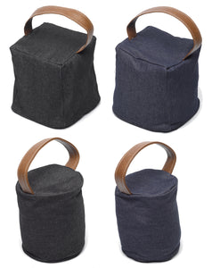 These door stop covers are made from cotton denim with a faux leather handle and are available in a cube or cylinder shape.
