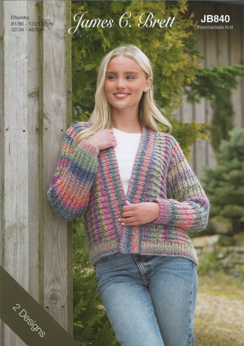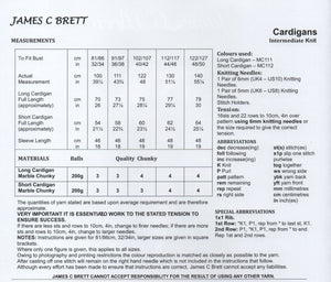 This chunky knitting pattern leaflet JB840 by James Brett will instruct you on how to knit a short or long cardigan.