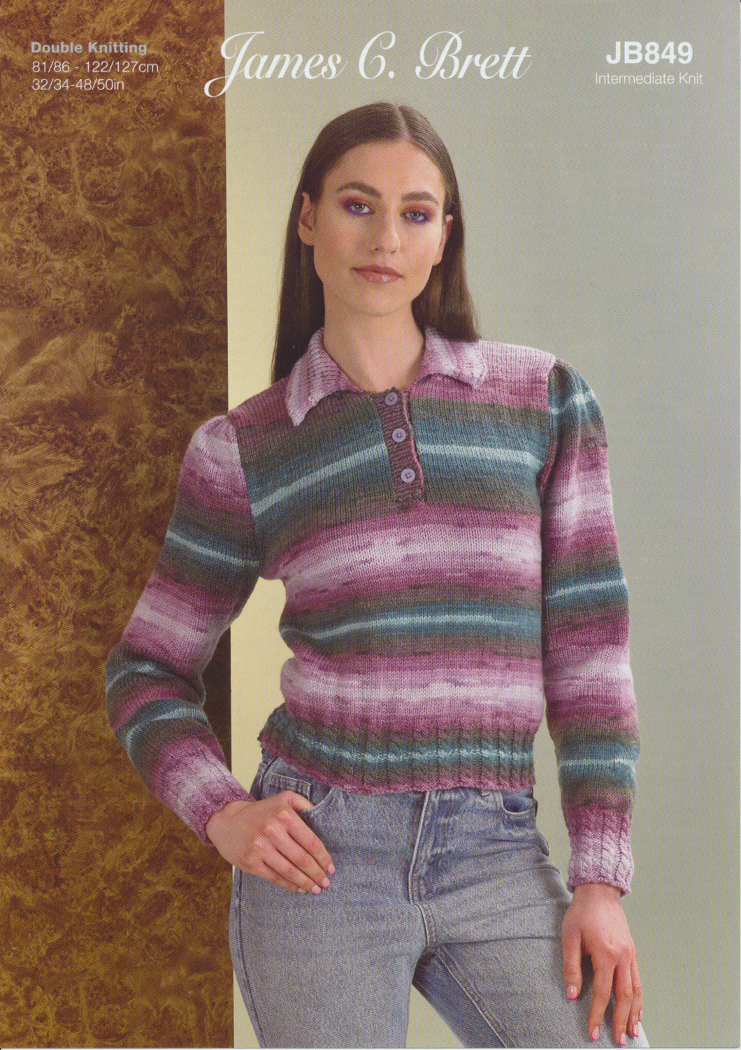 • Details: This James Brett double knit knitting pattern instructs you how to knit a lady's sweater with a collar and cable detail, using Aurora DK yarn.