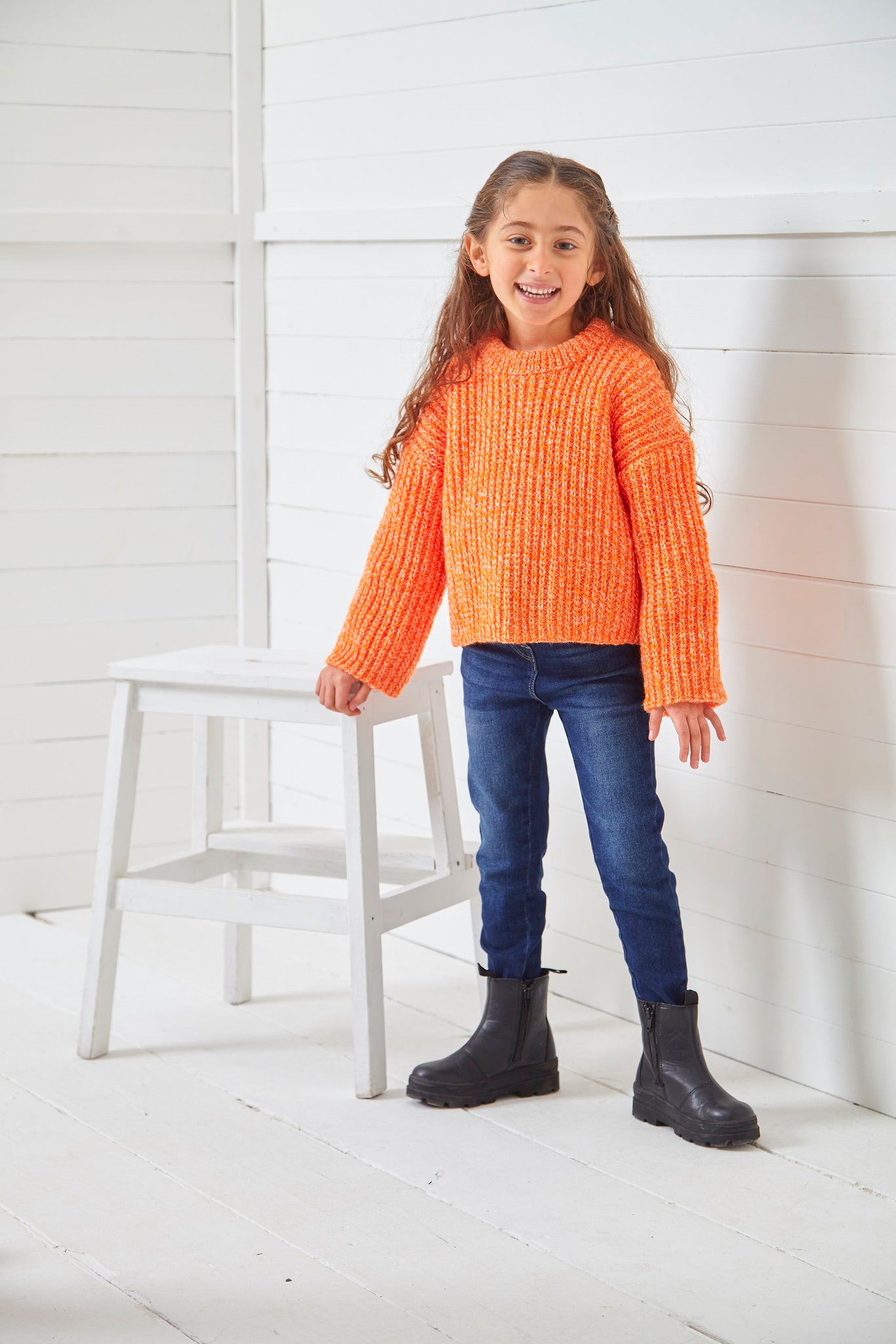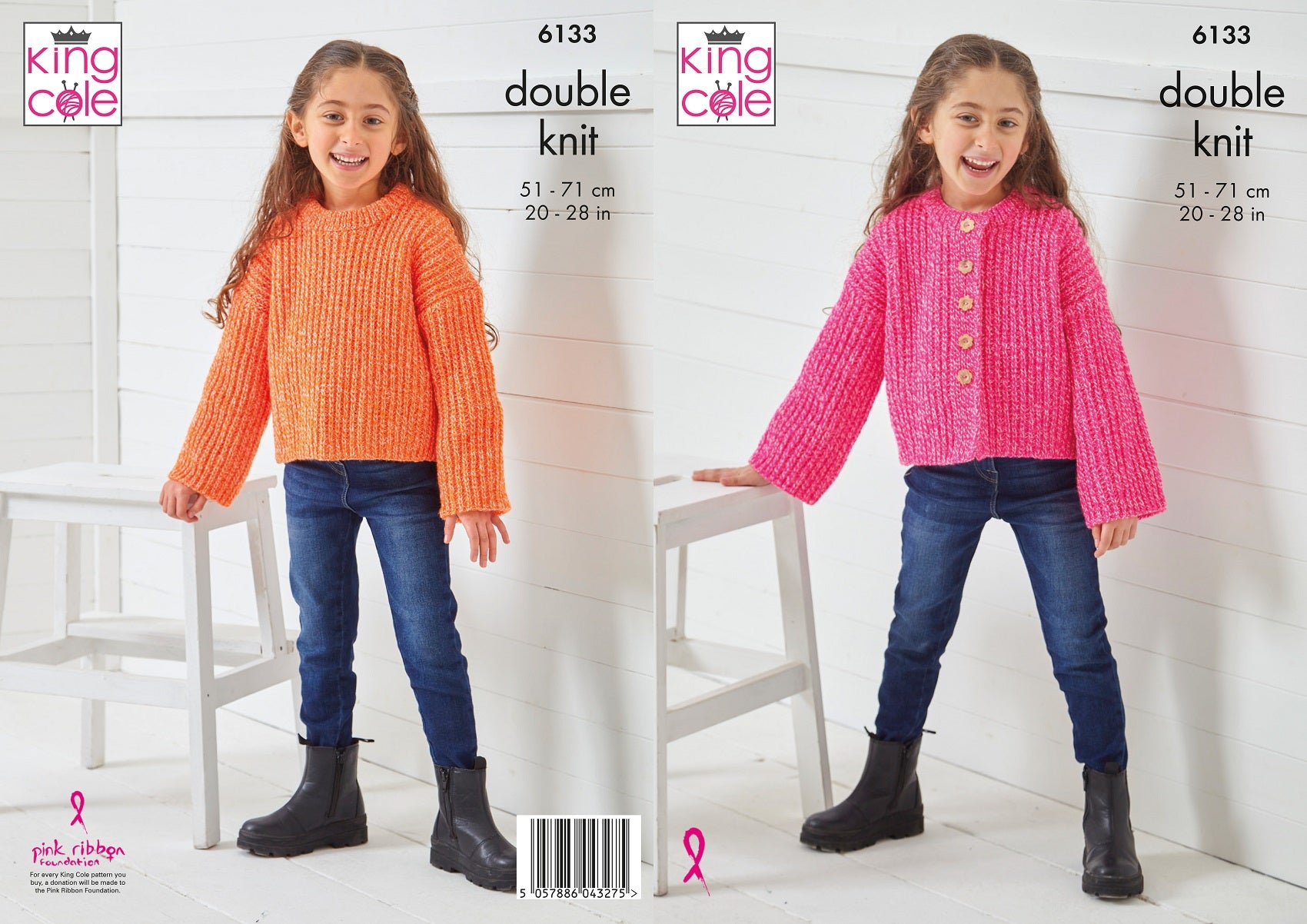 This double knitting pattern leaflet 6133 by King Cole will instruct you on how to create a kids sweater and cardigan with ribbed detail.