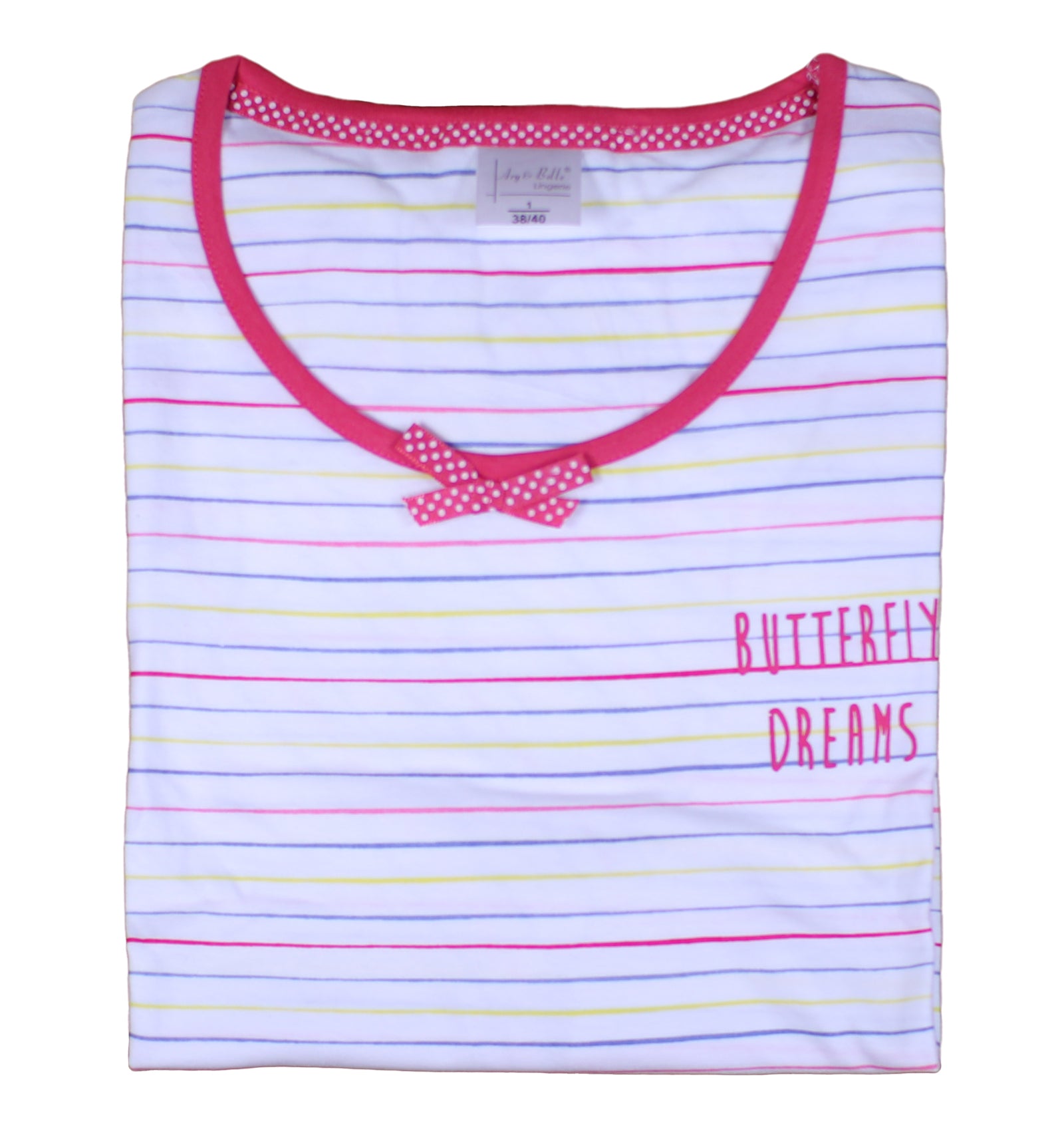 - Details: These ladies pyjama sets include a short sleeved striped top with pretty butterflies and 'Butterfly Dreams' printed on the chest and a pair of 3/4 length plain bottoms, making them a great lightweight options for the warmer months.